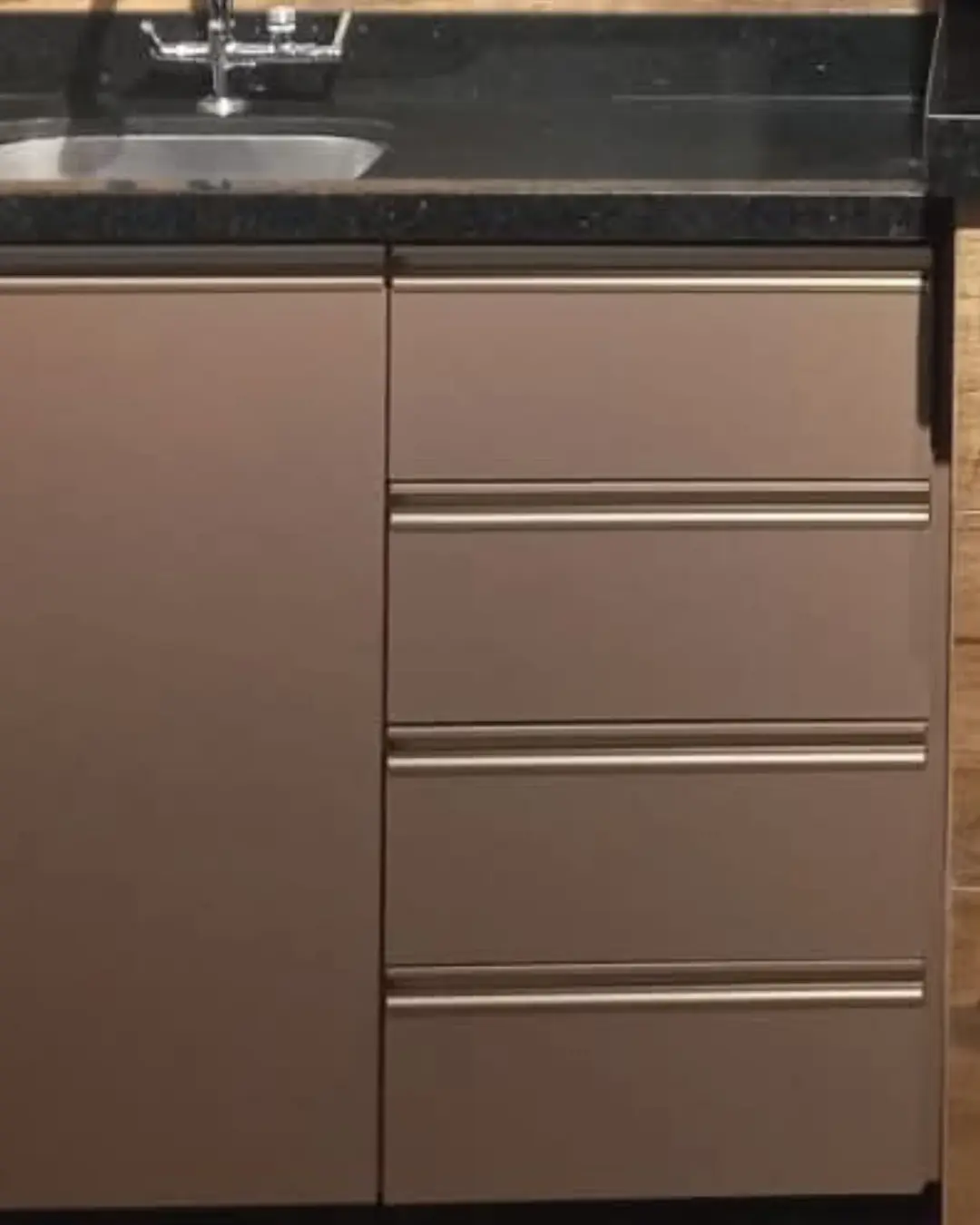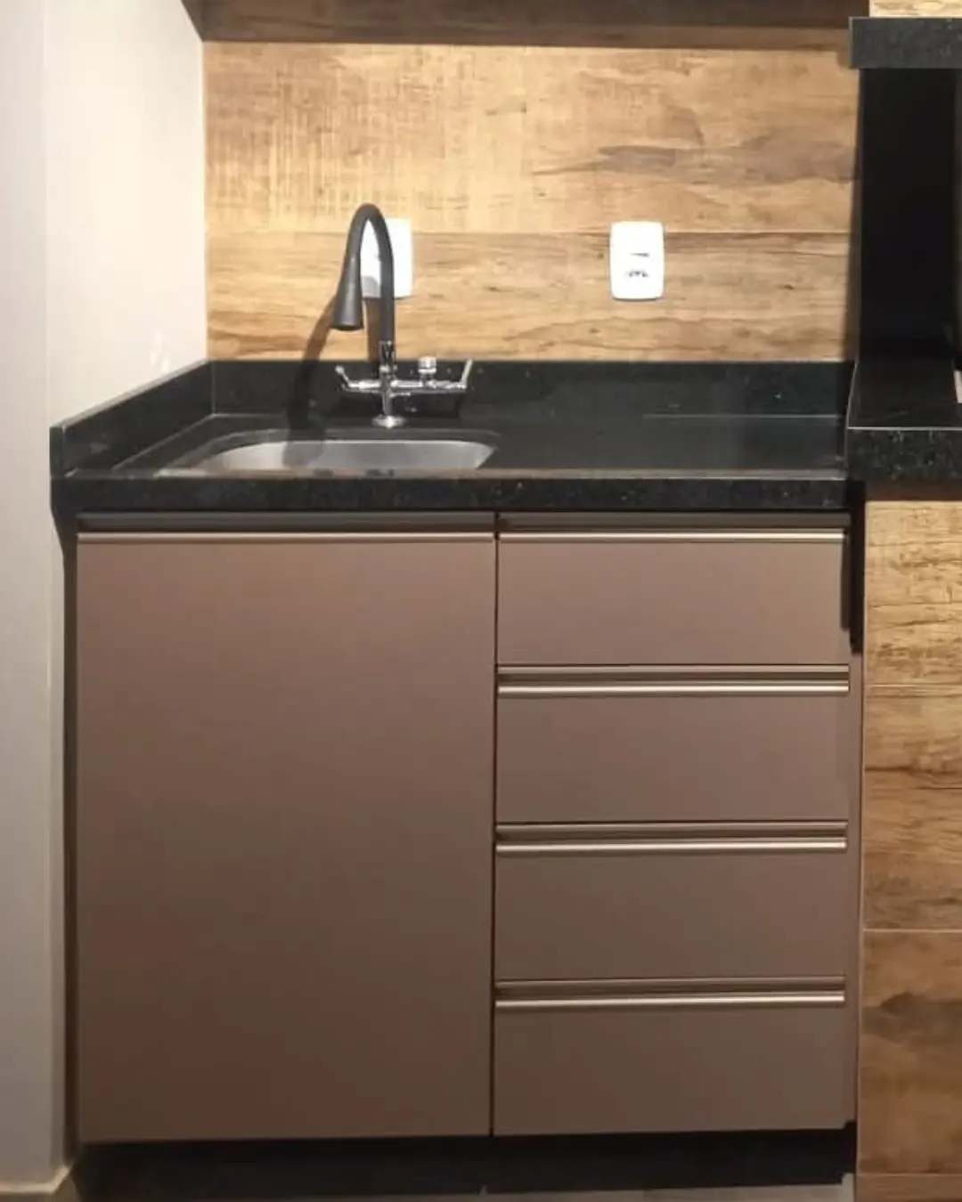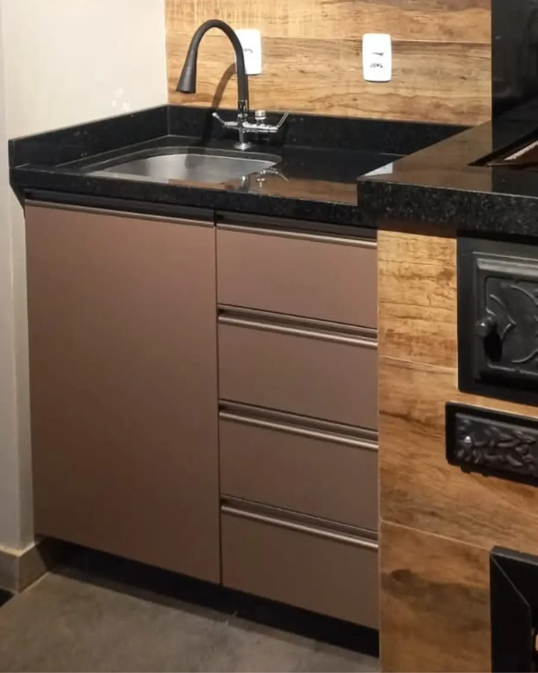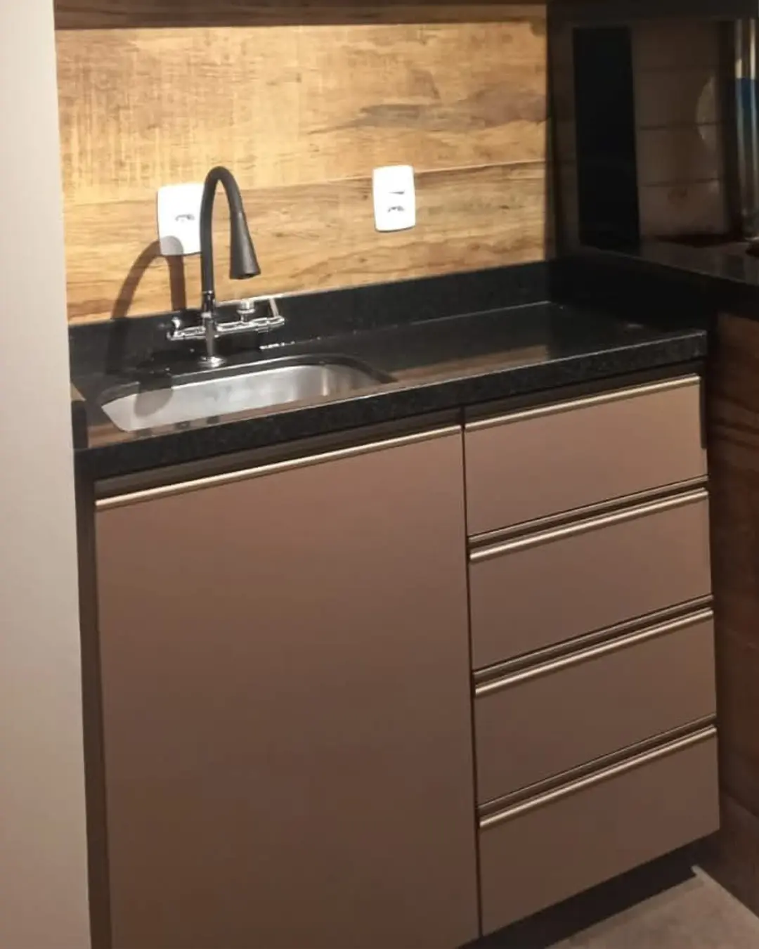 Os puxadores cava embutidos em alumínio reforçam o visual moderno e minimalista, além de oferecer praticidade no uso diário. O móvel é finalizado em um elegante tom fendi acetinado, que transmite sofisticação e combina perfeitamente com a bancada em granito preto absoluto e o revestimento amadeirado ao fundo, criando um contraste refinado e acolhedor.