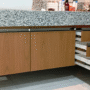 A bancada em granito cinza mesclado reforça a durabilidade e complementa o estilo contemporâneo do móvel.